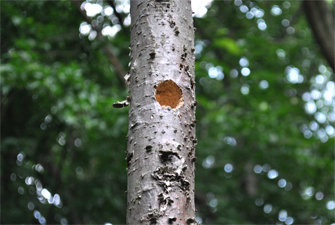 「らいちょうの森」の木の幹に小さな穴がありました。コゲラの巣のようです。